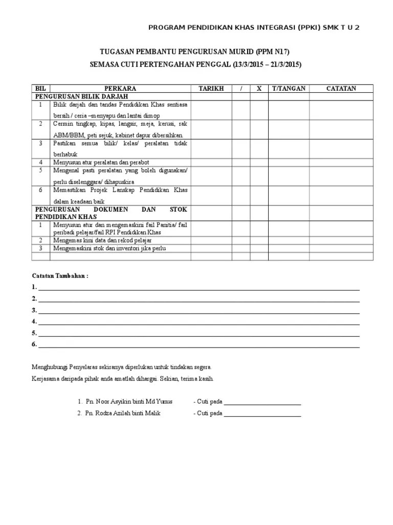 Laporan tugasan pembantu pengurusan murid (ppm) semasa cuti sekolah disediakan oleh : tugas pembantu pengurusan murid. Tugasan semasa cuti sekolah 5.